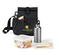 Features : Kit includes: stainless steel water bottle, plastic reusable food container and cotton cloth napkin Side pocket for water bottle. Fold top with Velcro closure and front zippered pocket. PEVA lining and PU fabric backing (non-PVC). This product is made from 51% recycled PET fabric.